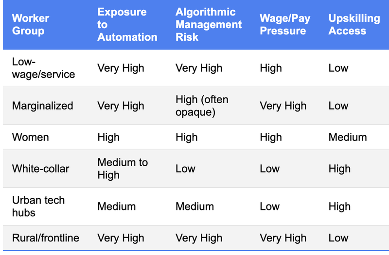 - AI automation is not neutral. AI disproportionately harms low-wage, low-skilled, minority, and female workers more than white-collar professionals.